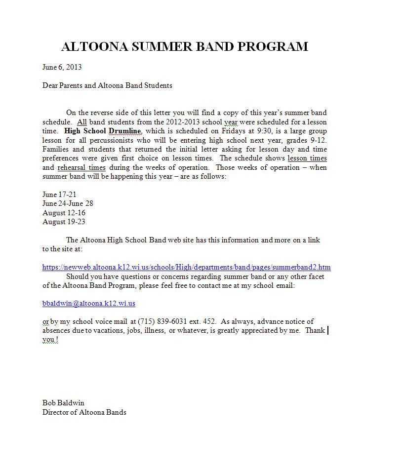 If you have questions regarding the summer band schedule, please e-mail Mr. Baldwin via the e-mail link below, or leave a message on his school voice mail at 839-6031 ext.452. Please notify Mr. Baldwin at least 24 hours in advance if student(s) will be missing from lessons.