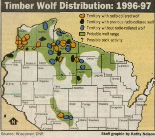 parts of six counties. The wolf range in central Wisconsin reaches from